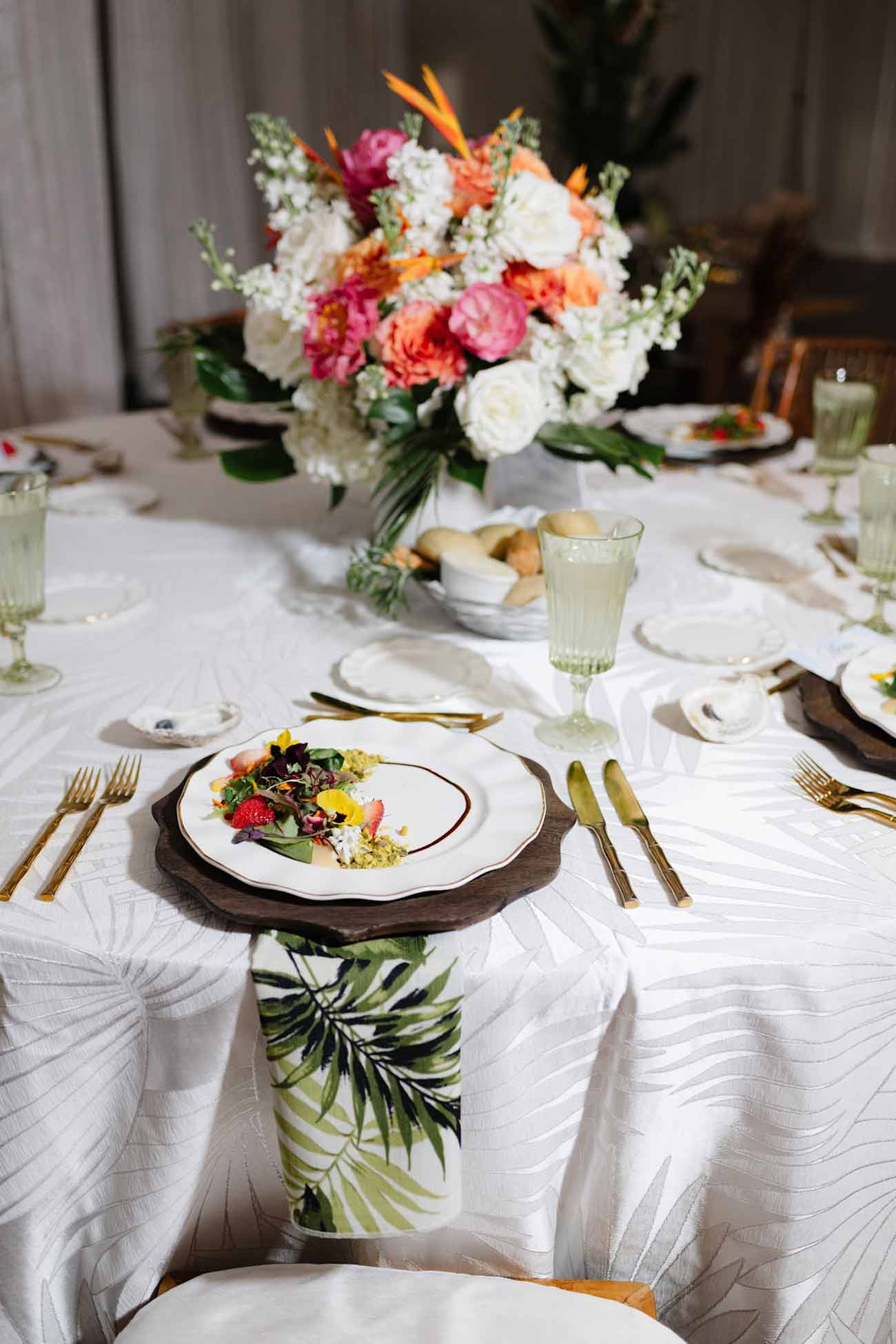 Few Florida wedding places deliver atmosphere the way Loggerhead Marinelife Center does. The ceremony design featured lush white florals layered with bold pink and orange blooms and touches of tropical greenery, echoing the vibrant coastal landscape only steps away. As the celebration moved into the reception space, the palette shifted into a stunning mix of white textures and bright tropical accents, creating a beach-inspired environment that felt fresh, modern, and undeniably Florida.